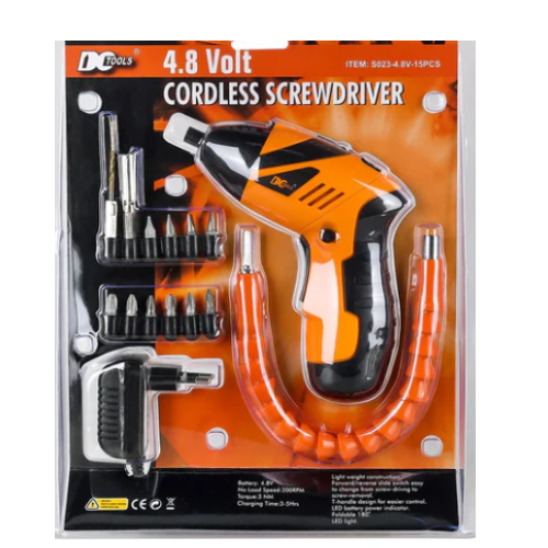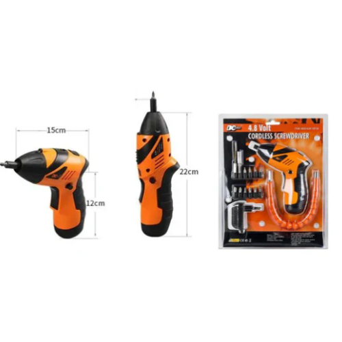 ¿QUÉ BENEFICIOS TRAE EL TALADRO DESATORNILLADOR INALÁMBRICO?Taladro Desatornillador Inalámbrico resistente de 4,8 V le ahorra tiempo dedicado a colocar sujetadores. Viene con puntas que son compatibles con los tamaños de tornillos más utilizados. Un soporte que permite tener una mano libre mientras trabaja.Este destornillador de alta velocidad funciona tanto hacia adelante como hacia atrás para aplicaciones de instalación y extracción.CARACTERÍSTICAS-Modelo: S023-4.8V-15PCS-Fuente de alimentación: 4,8 V DC-Velocidad sin carga: 200RPM-Configuración de avance y retroceso: Sí-Voltaje de carga: 6V DC-Corriente de carga: 300mA-Tiempo de carga: 3-5 horas-Tipo de batería: Ni-Cd-Juego de destornilladores de 15 piezas-Sin velocidad de carga de 200 y el par máximo es de 3,5 nanómetros-La luz LED a bordo ilumina las áreas de trabajo oscuras, como debajo de mesas y armarios-Mecanismo de mango giratorio de 2 posiciones para total versatilidad y accesibilidad-Interruptor deslizante de avance y retroceso para un fácil atornillado y extracción de tornillos-El Ajuste de torsión y el agarre de goma sobre el molde proporcionan comodidad y evitan el deslizamiento.CONTENIDO1. Taladro inalámbrico2. Cargador3. Juego de 15 cabezales para desatornillar4. Extensor